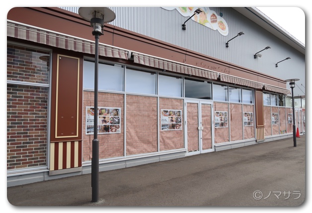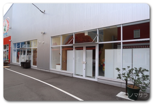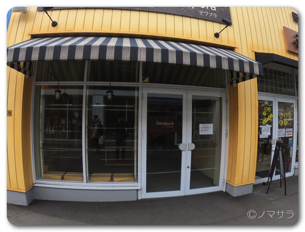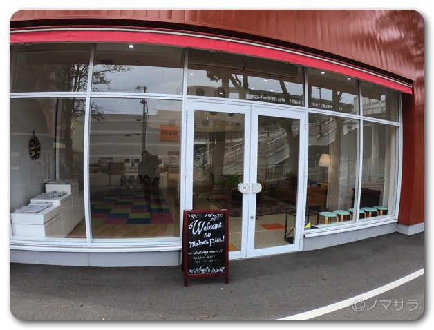 ここから歩いて行くとすぐにメイカーズピアの敷地に到着。まず一番最初に目に入る店舗がすでに空き物件となっていました。ガラス張りでは目立つからでしょうか、壁紙がガラス一面に貼られてカモフラージュされていました。