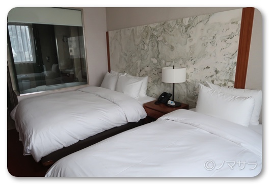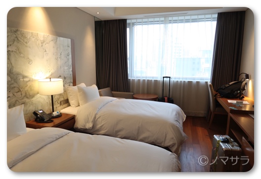部屋は適度な広さで清潔感あるモダンなインテリア。ツインルームのベッドは普通サイズのシングルとキングサイズが並んでおりサイズが違います。