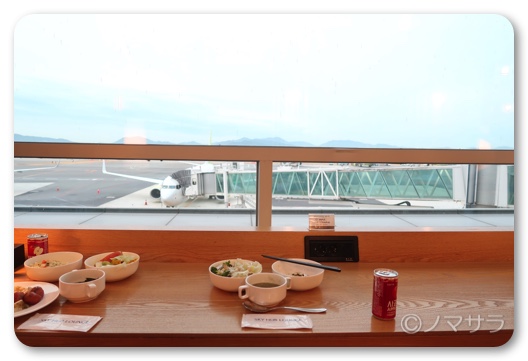 デザートにフルーツとコーヒーを飲んで十分満足、満足。ラウンジからは滑走路が見えるので飛行機の離発着を眺めながらくつろぐことができます。