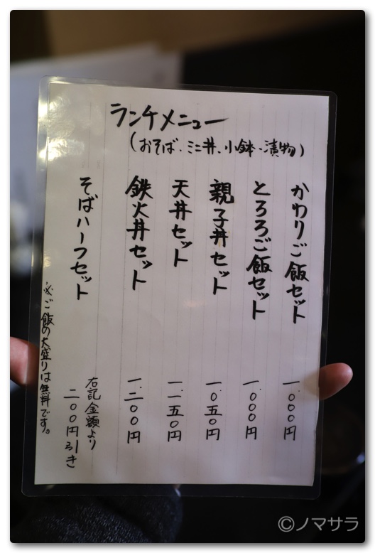 メニューはそば単品もありますが、ランチならセットメニューがお得。とろろご飯や鉄火丼、天丼のセットなどがあります。今回は天丼のセットを注文。