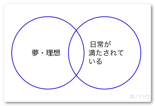 小野氏が考えるひとつ目の輪は夢や理想、そしてもうひとつの輪は日常が満たされていること。大きな夢や目標は達成するまでに時間や労力がかかるために疲弊してしまいます。また「これさえあれば幸せになれる!人生がバラ色になる!」という考えたかは危ういので避けましょう。例えば東大に合格すれば人生バラ色と教育されてきて、猛勉強の末合格したけど、いざ入学したら目標を失い引きこもりになってしまったという例が少なからずあります。
