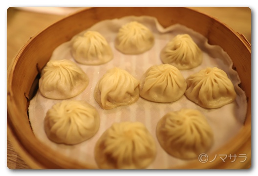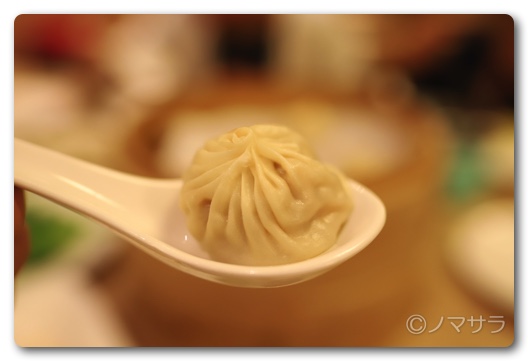 まずはノーマルの小籠包が到着。下から運んでくるまでにタイムラグがあるのか、超アツアツではなく、ちょうど食べ頃といった感じ。アツアツをフウフウいいながら食べたい人にはちょっと物足りないかもしれません。ただし、子どもにとってはすぐ食べてもやけどをすることのない温度なので、我が家にとってはこれでちょうどいい感じ。