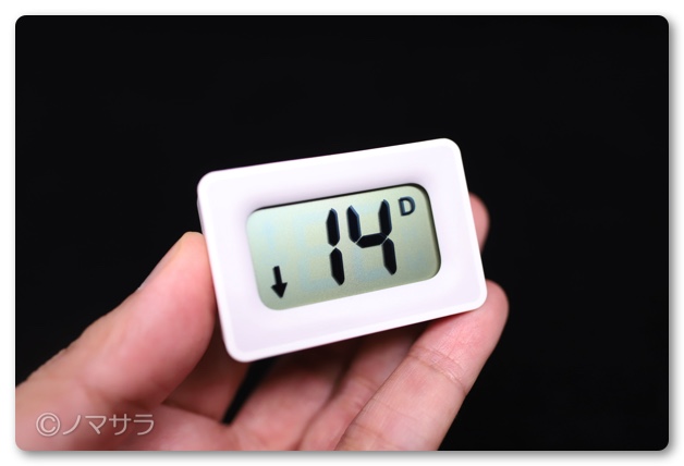 モードボタンと▲ボタンを同時に押すとリセットされ、日数を設定することができます。▲ボタンを長押しすると高速で進みます。最大日数は99日、約3ヶ月。スタート/ストップボタンを押すとカウントが始まります。とりあえず2週間で設定してみました。
