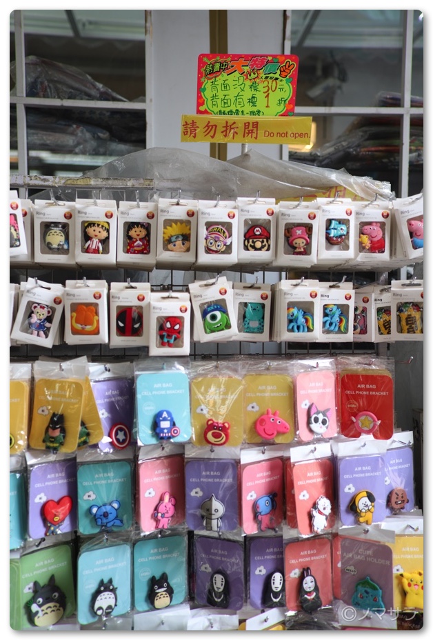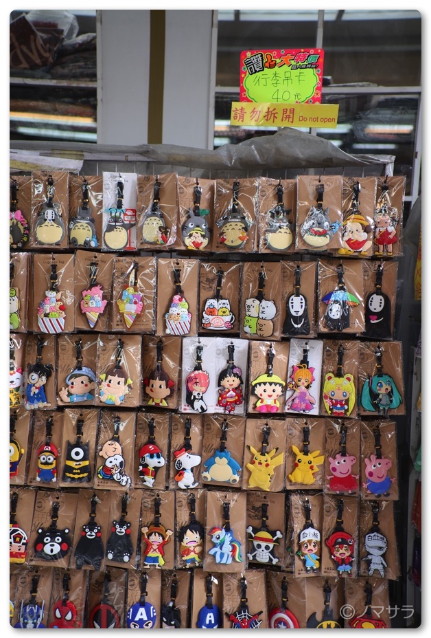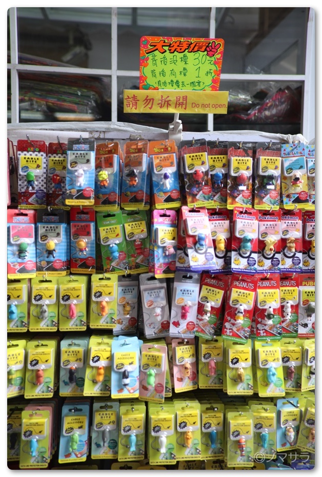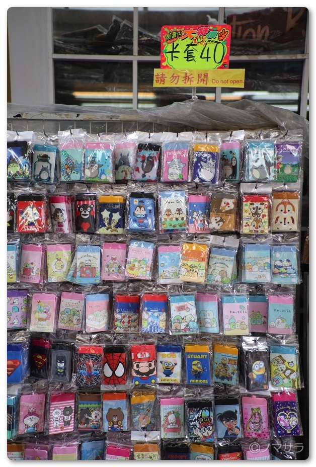 しかも価格が激安で日本の価格の1/5〜1/10ぐらい。パスケースはひとつ40元(約140円)、日本で大人気のケーブルバイトはひとつ30元(約100円)と信じられない価格。ライセンスもきちんと入っているためパチモンではありません。どうやらここは問屋みたいで業者のような人たちがまとめ買いしていました。