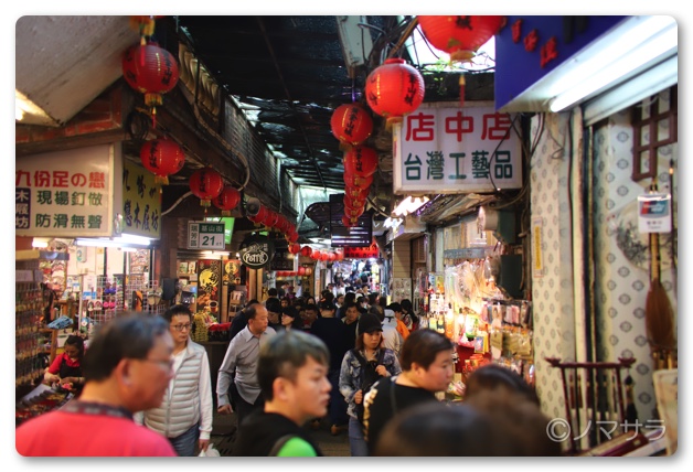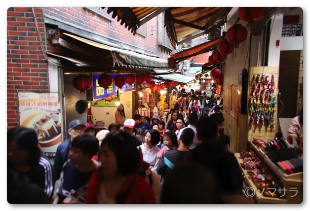 写真などで見る九份の有名な街並みまでは細い通りを10分ほど歩かなくてはなりません。ラッシュアワーのような人混みで両サイドに店舗があるため、すれ違うのもかなりたいへん。スリも多いとのことなのでリュックなどは気をつける必要があります。