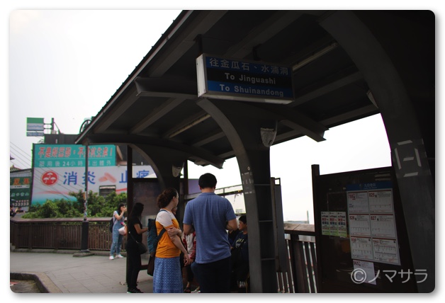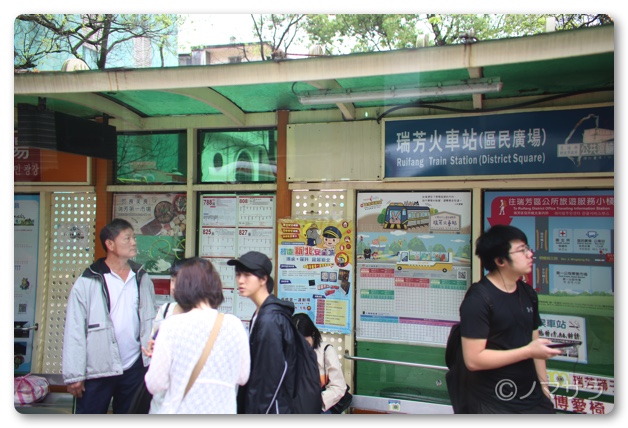 端芳のバス停は鉄道の駅から200mほど離れた場所にあります。端芳駅の改札を出ると左手にタクシー乗り場があるので、そこを超えて左へ曲がり道路をそのまま真っ直ぐ行くと信号機のすぐ近くに九份行きのバス停があります。1本道なのでおそらく迷うことはないはず。