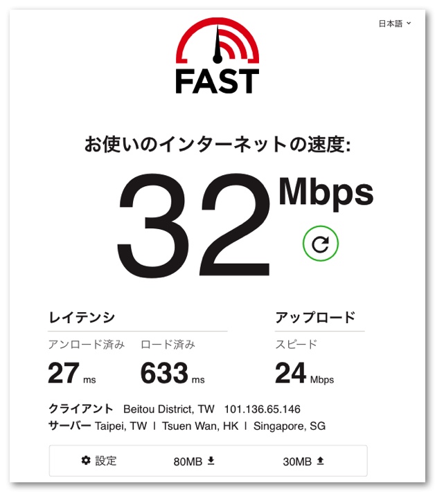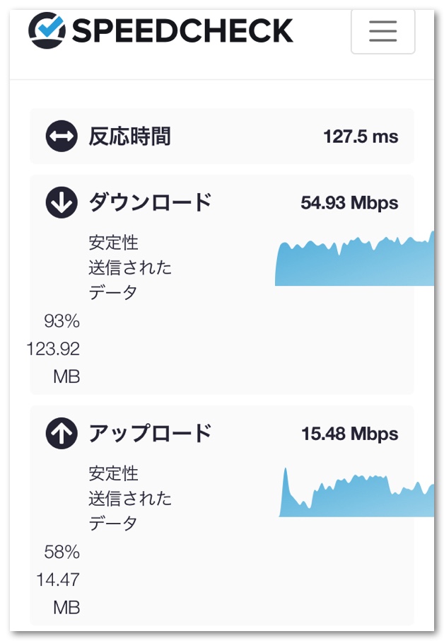 スピードはFast.comのテストでは下り32Mbps、上り24Mbps、SPEED CHECK では下り54Mbps、上り15Mbpsという結果に。もちろん場所や時間帯で速度は違うので多少はブレますが通常の使い方ならほぼストレスを感じることはありません。