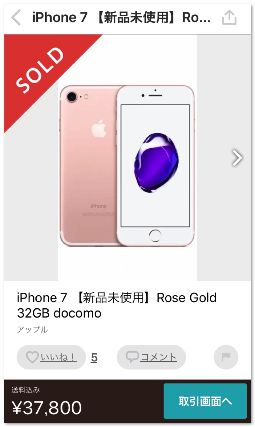 一方、妻の母は全部お任せしますと言ってくれたので、格安SIMで運用することにしました。まずは本体をできるだけ安く手に入れるためメルカリでしばらくチェックし、新品未使用品のiPhone7 32GBローズピンクが37,800円で出品されていたので5%オフクーポンを使い35,910円で購入しました。