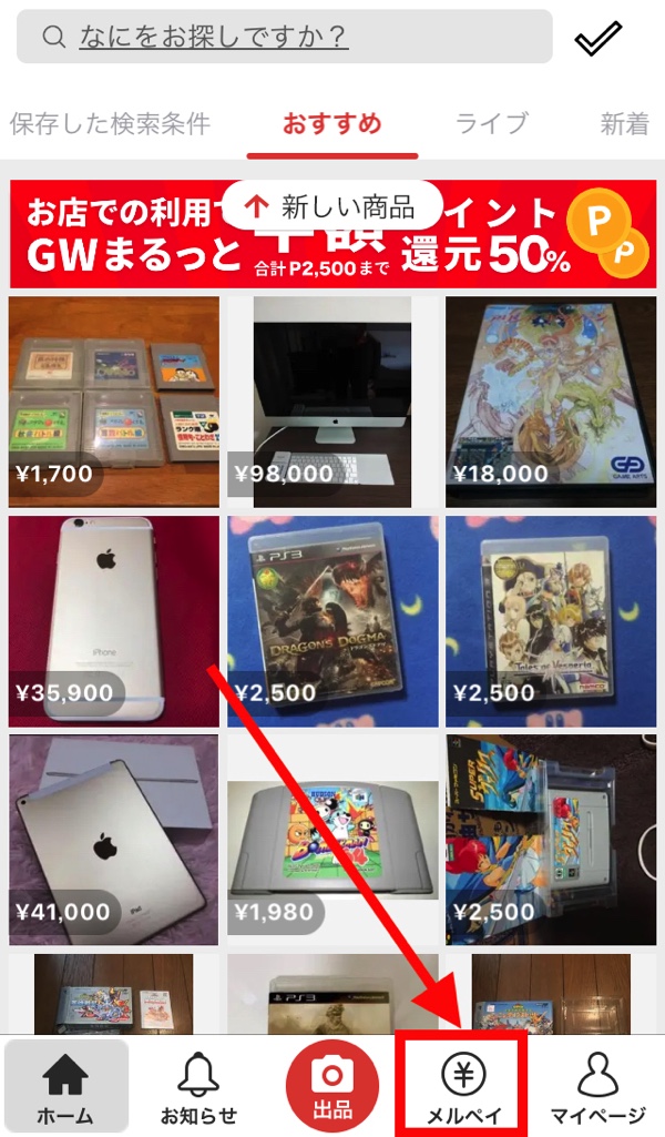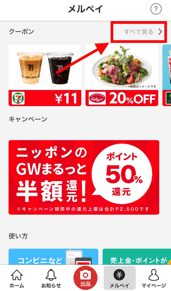 「メルカリ」アプリ内の「メルペイ」をタップ
