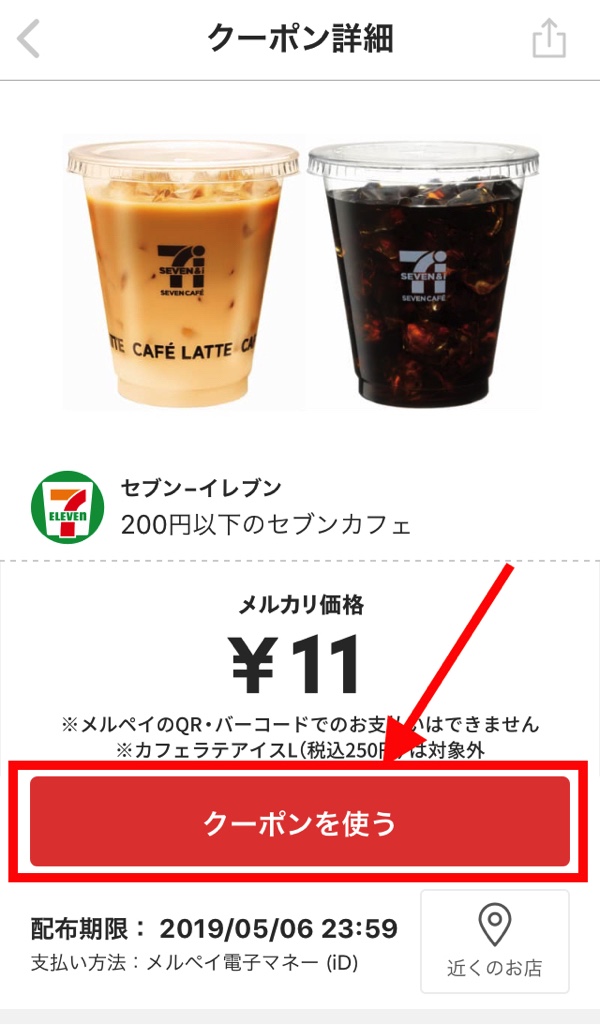 「セブンカフェ 11円」の「クーポンを使う」をタップ