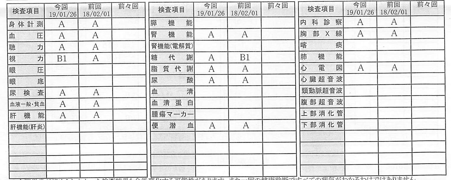 先日、受けた診断の結果が出て郵送されてきました。今回は視力を除いてオールAという結果となりました。視力は眼鏡をかけているのですが、この日は度の弱めの眼鏡で受診したためBという結果になりましたが、眼鏡さえ変えればA判定になります。46歳でこの健康状態の人は少ないのではないでしょうか。もちろん、健康でいるために食生活をはじめかなり気をつけており、ある程度の努力の結果だと自負しています。