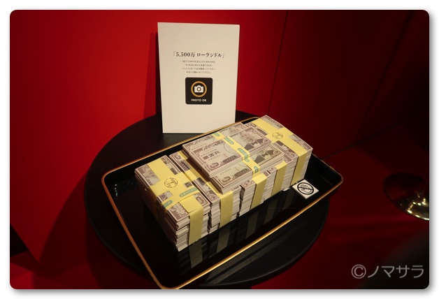 ROLANDが一日で稼いだ最高額5,500万円の模造紙幣が置いてあり実際に持つことができます。エグい世界だ…。