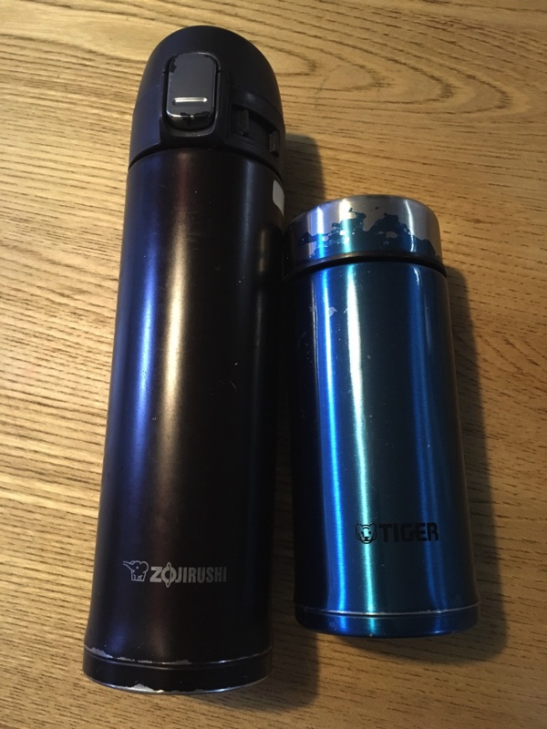 もうかなり前からどこへ行くのにもマグボトルを持ち歩いています。仕事へ行くときは紅茶を入れた500mlとコーヒーを入れた350mlの2つを持っていき、昼食の後には温かいコーヒーを飲んでいます。前述の日本ガイシの浄水器で濾過した水道水をYaotomi石に一晩浸けたものを使っており、どちらも美味しくて、ペットボトルの紅茶や缶コーヒーを飲むことはなくなりました。
