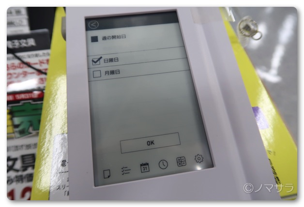 カレンダーはひと月表示のみですが、程よい大きさで見やすく、週の開始日を日曜日、月曜日のいずれかを選択できます。
