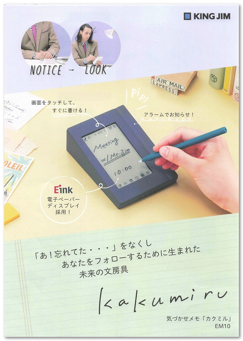 気づかせメモ「カクミル」は、液晶画面にタッチするだけですぐに起動し、紙にペンで書くようなアナログ感覚で、手書きのメモを記録することができるデジタルツール。画面には電子ペーパーディスプレイを採用し、書いたメモを常時表示させることが可能。また、メモにはアラーム設定ができるため、忘れてしまいがちな予定やTo Doリストをアラーム音と画面表示で知らせてくれます。付属機能として、電卓やカレンダー、時計なども備えているため、「カクミル」があればデスク上のツールをひとまとめにすることができます。