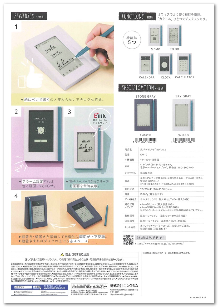 気づかせメモ「カクミル」は、液晶画面にタッチするだけですぐに起動し、紙にペンで書くようなアナログ感覚で、手書きのメモを記録することができるデジタルツール。画面には電子ペーパーディスプレイを採用し、書いたメモを常時表示させることが可能。また、メモにはアラーム設定ができるため、忘れてしまいがちな予定やTo Doリストをアラーム音と画面表示で知らせてくれます。付属機能として、電卓やカレンダー、時計なども備えているため、「カクミル」があればデスク上のツールをひとまとめにすることができます。