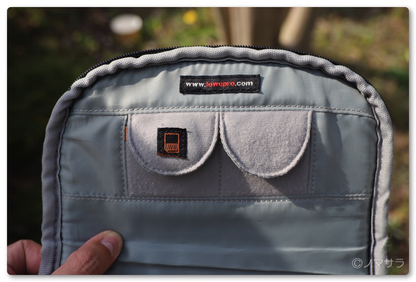 その他、蓋の内側にはSDカードなどを入れるポケットがあります。ここにSDカードを常時入れておけば、万が一カメラにSDカードを入れ忘れた時でも助かります。PCで読み込みをしてそのまま戻すのを忘れたことが過去何度かありましたが、ここにSDカードを入れていたおかげで無事撮影することができました。