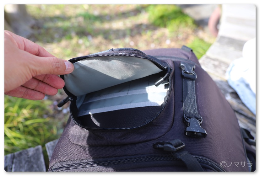 その他、蓋の内側にはSDカードなどを入れるポケットがあります。ここにSDカードを常時入れておけば、万が一カメラにSDカードを入れ忘れた時でも助かります。PCで読み込みをしてそのまま戻すのを忘れたことが過去何度かありましたが、ここにSDカードを入れていたおかげで無事撮影することができました。