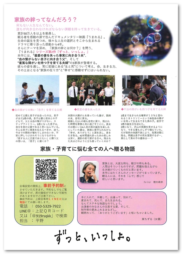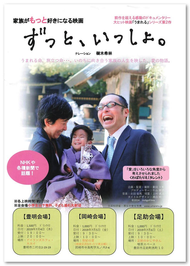 そして、半年ほど前に会ったときに「感動した映画があり、自分で上映会を開催したい」と言っていたら、これまた7月に自主上映会を開催するとのこと。今まで上映会をした経験はないのにいやはや行動力が素晴らしい。今回上映されるのは「ずっと、いっしょ。」というドキュメンタリー映画。
