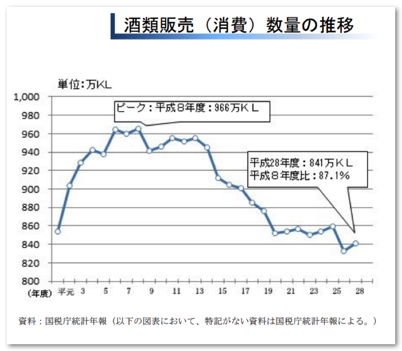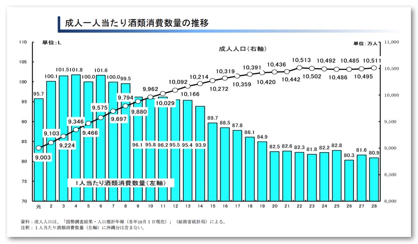 そして成人人口はまだ緩やかに増えていますが、酒類消費数量は年々減少の一途を辿っています。