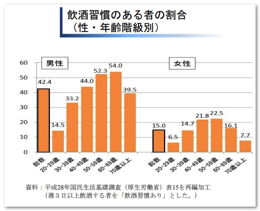 飲酒習慣のある者の割合を見てみると2029歳の男性は14.5%、女性にいたっては6.5%しかいません。若くなるほどに割合が減っており、おそらく今後も増えることはないと思われます。これらのデータを見る限り、飲酒をする人は若年層ではマイナーな存在であり、飲まない人こそがメジャーであることがわかります。居酒屋やレストランは今後はいかに飲まない人が楽しめるようなメニューを考えて、客単価を上げる方法を見出さなければ生き残っていけないような気がします。