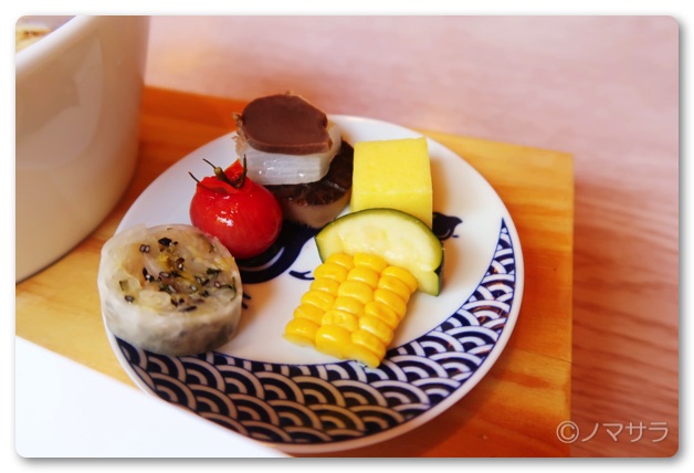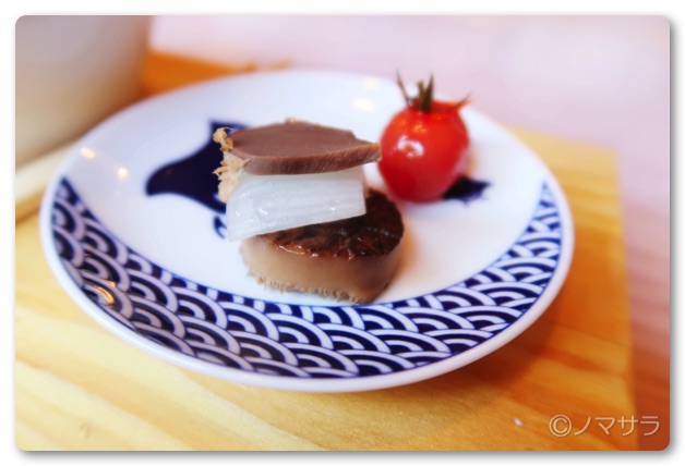 どれも美味しいのですが特に「ココナッツかましたプチトマト」と「新生姜なキャベツ」が絶品。プチトマトはりんごジュースにココナッツリキュールを少し混ぜたものに3日間ほど漬け込んであり、トマトの酸味とりんごのほのかな甘み、ココナッツの香りが絶妙なバランスで融合し口の中で広がります。キャベツは軽い浅漬けになっており、これまた激ウマ。同席した女性曰く、このセットが3皿ぐらいあったら永遠と飲めそうとのこと。
