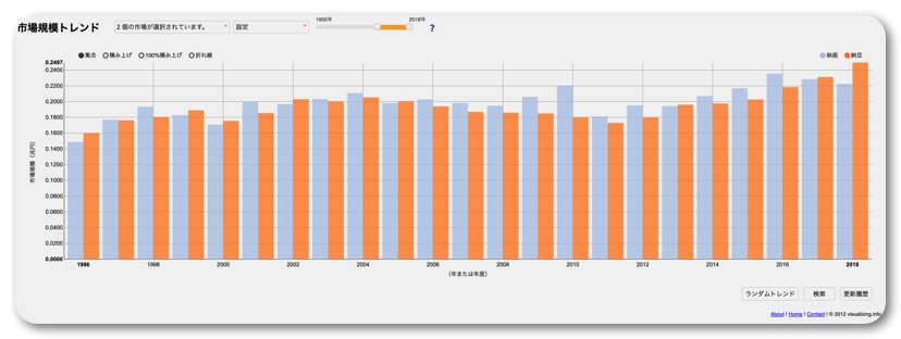 たまたま出てきた「映画」と「納豆」の市場の比較。規模が近い上に、年度ごとに相関関係があるのは偶然でしょうか?(笑)