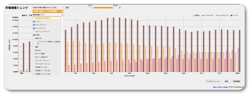 左上の「市場規模トレンド」をタップするとランダムに2〜3つの市場を選択してグラフ表示してくれます。似たような市場が並ぶこともあれば、まったく関係ない市場が並んだりしますが、見ていて飽きません。ある市場が意外に売上規模が大きかったり、逆に小さかったりと新しい発見があり、市場経済に興味のある方ならかなり楽しめると思います。