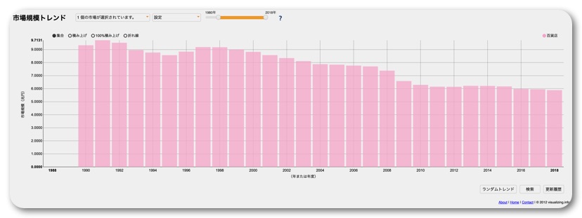こちらは百貨店の売上規模のグラフ。残念ながら右肩下がりがずっと続いており、今後も続くことが予想されます。