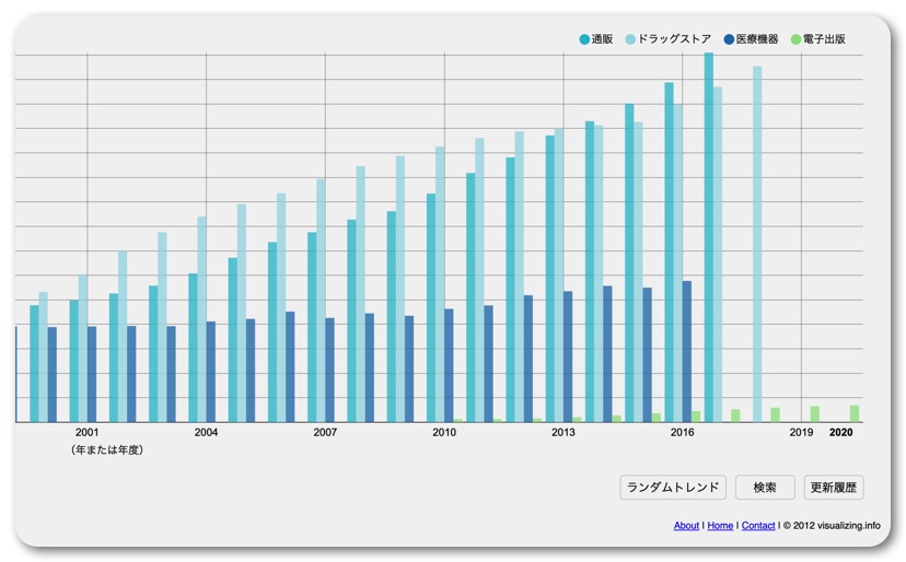 世の中には様々な業種があります。売上が右肩上がりの業種もあれば、年々減少し続けている業種もあります。また右肩上がりとは言ってもまだまだ市場規模が小さく対抗する業種とは大きな開きのあるようなジャンルもあれば、すでに規模も大きくなり既存の市場規模を上回るようなものまで多種多様。それら多種多様な業種の売上規模と売上推移がグラフでひと目でわかる素晴らしいサイトがあります。それが今回紹介する「市場規模トレンド」。いくつあるかわからないほど多種多様な市場があり、同時に20個まで選択できます。グラフを重ねて比べることができますので、規模と推移を比較するのにとても便利。