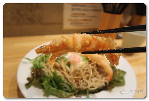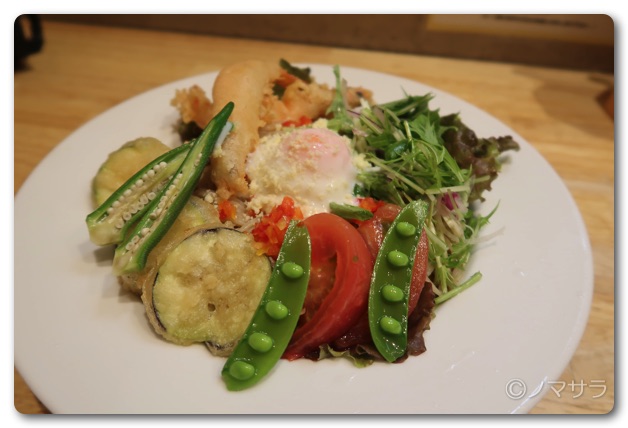 並び始めてから30分ほどで着席し、5分ほどで出てきました。見た目は彩り豊かでいかにも美味しそう。トッピングは脱皮したての柔らかい殻をもつ「ソフトシェルシュリンプ」、ナス、ズッキーニの天ぷらのほか、トマト、オクラ、さやえんどうなどの夏野菜と温泉卵が盛り付けられています。