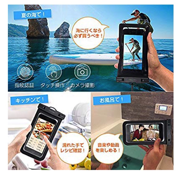 【様々な場面で大活躍】スマホをケースに入れても、何も付けてないような鮮明な写真撮影とスムーズなタッチ操作が可能になります。野外ライブ、週末の釣りや水泳、レシピを見る時、料理を作りながら携帯を操作したい時、冬の雪遊び、温泉/お風呂で音楽やビデオを楽しみたい時、海辺での撮影など様々なアウトドアとレジャーの場合に役立ちます。梅雨時期にも是非傘と一緒に。
