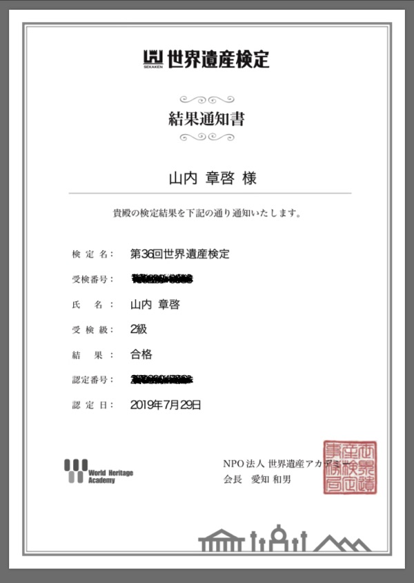 昨年から旅行業務に携わるようになり、世界遺産についても勉強するようになりました。7月7日に世界遺産検定の2級を受検しました。2月末に3級を受験、合格したので続けて受験することに。正直、3級は余裕だったのですが、2級はかなりレベルアップしており、3級の受験の時と比べて3倍ぐらいの時間をかけました。先日、結果発表があり無事合格しておりました。試験中の自己採点でも確実に合格点を上回っていて、すぐ後にHPに掲載された回答と照合しても合格点を遥かに超えていたので間違いないとは思っていましたが正式に合格を確認できました。