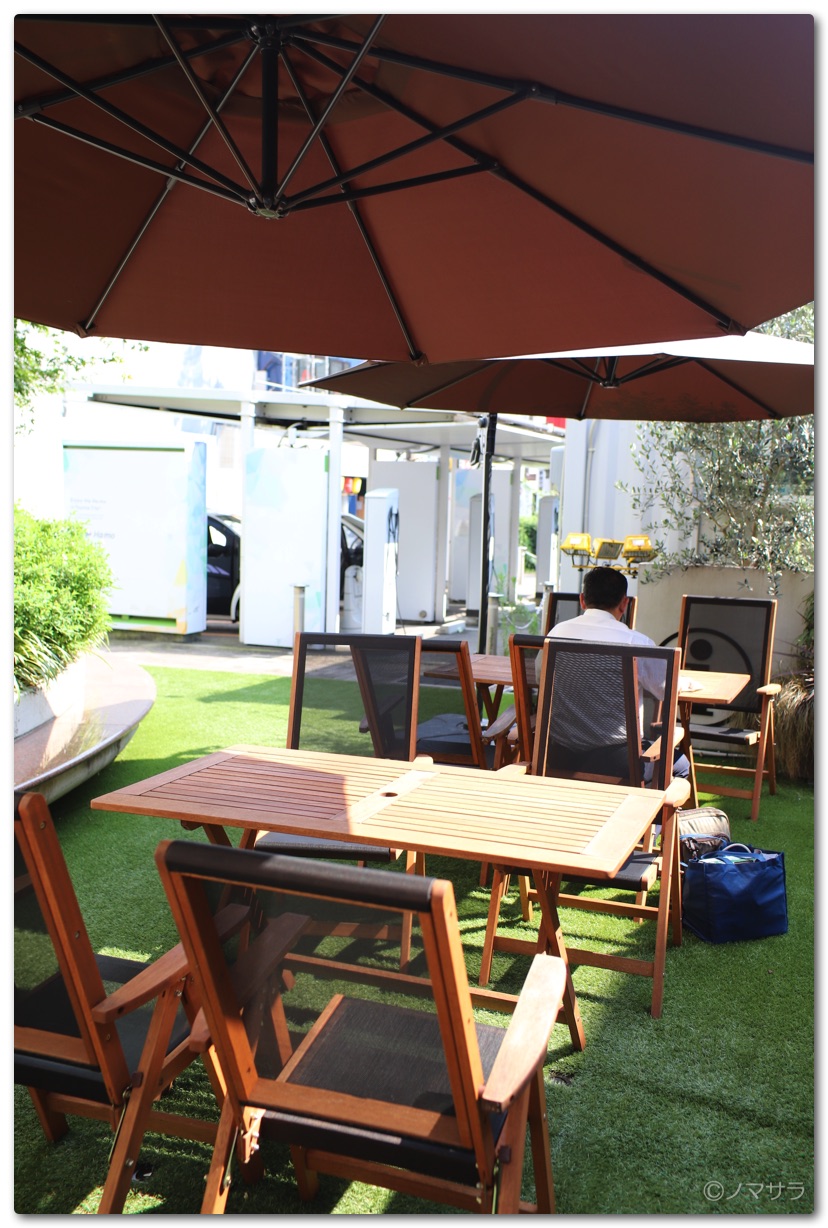 店の前にはパラソル付きのテーブルと椅子があり、ゆっくり座って飲むことができます。