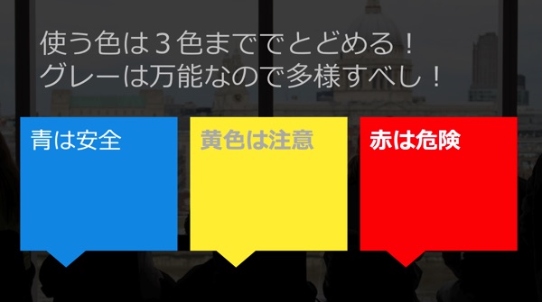 青は安全、黄色は注意、赤は危険という社会的ルールがあるので、それを利用しましょう。