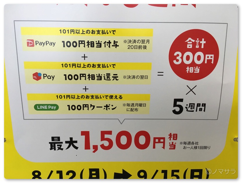 期間中にメルペイ、LINE Pay、PayPay、のバーコード決済で一度に101円(税込)以上の支払いをすると、各サービスで1週間に1回100円相当、5週間で最大1,500円相当お得にお買い物ができます。