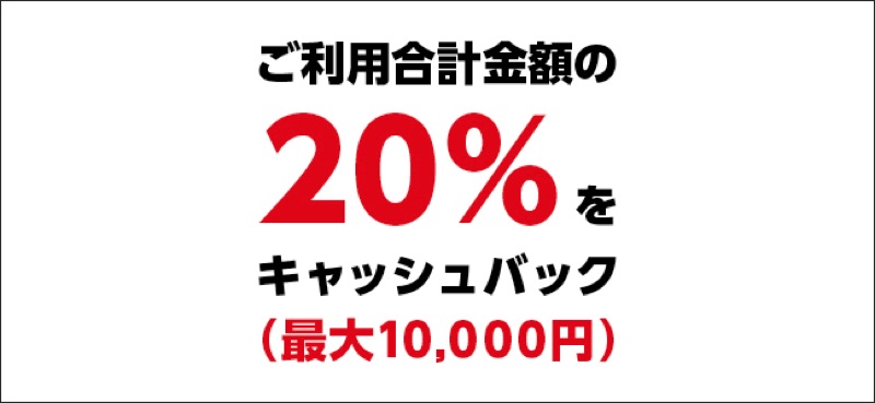 キャンペーン期間は2019年 8月 16 日(金)〜 2019年 12月 15 日(日)までとロングランでの開催になります。参加登録時期にかかわらず、期間中の利用金額が集計されます。利用金額の20%がキャッシュバックされ、上限額は1万円なので5万円までの決済に適用されます。