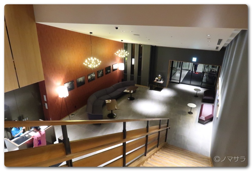 ロビーは吹き抜けになっていて開放感があり2階へはそのまま階段で上れます。玄関にはレモンやグレープフルーツなどが入ったデトックスウォーターが置いてあり自由に飲むことができます。