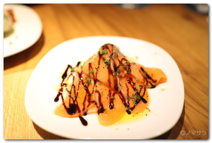 前菜は「厚切り生ハムのワサビソース」「スモークサーモンのバルサミコソース」「シェフのポテトサラダ」をチョイス、ピザは定番のマルガリータを選びました。