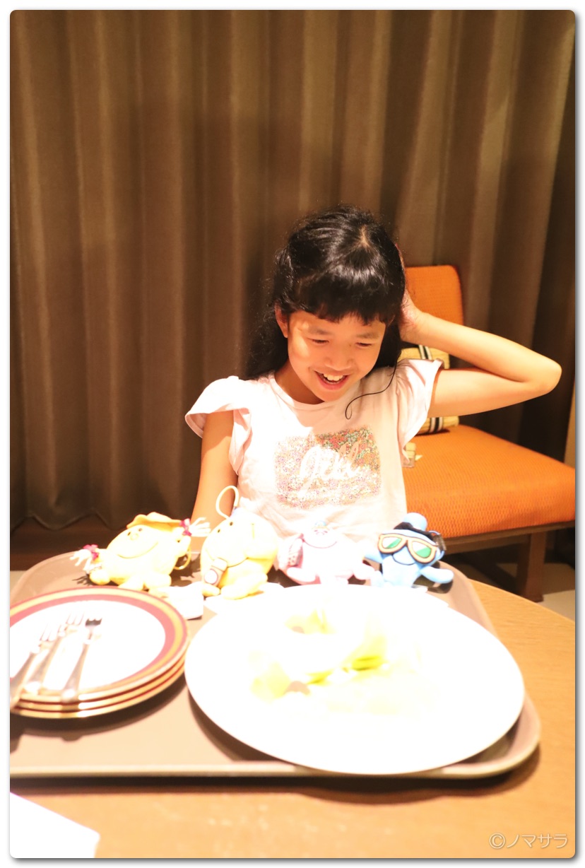 この日はちょうど長女の誕生日だったため、ホテルからフルーツ盛り合わせと、BonVoyのぬいぐるみ全4種類をサプライズでプレゼントしていただきました!