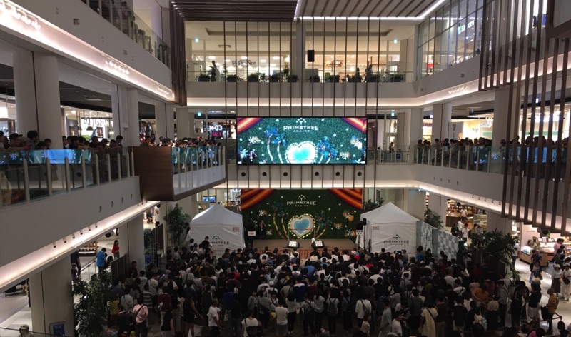 イベントが行われたのは地方のSCのイベント会場。3階まで吹き抜けになっておりそれぞれの階も大勢の人で賑わっていました。13時からと16時の2回コンサートが開かれ、2回目の16時の回を見るため15時過ぎに到着し場所を取って待っていました。
