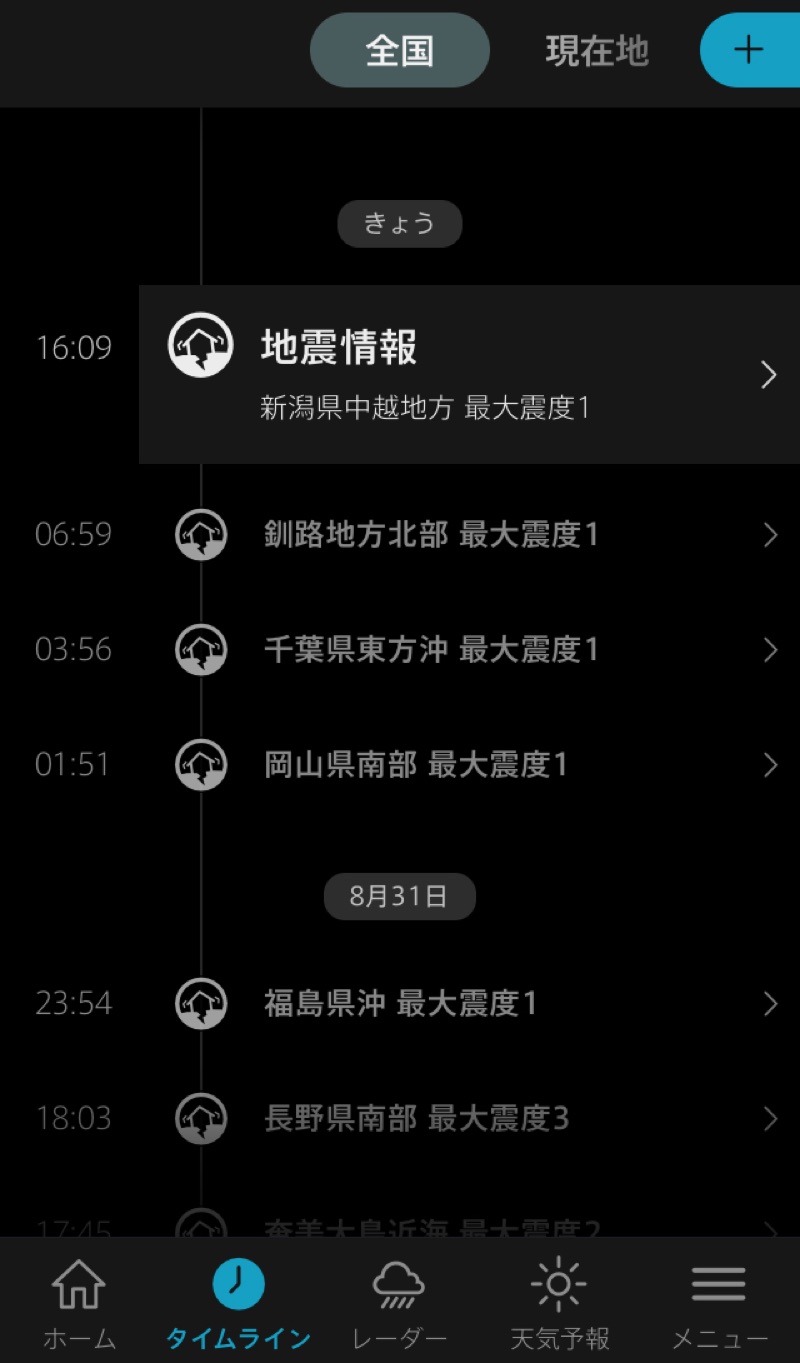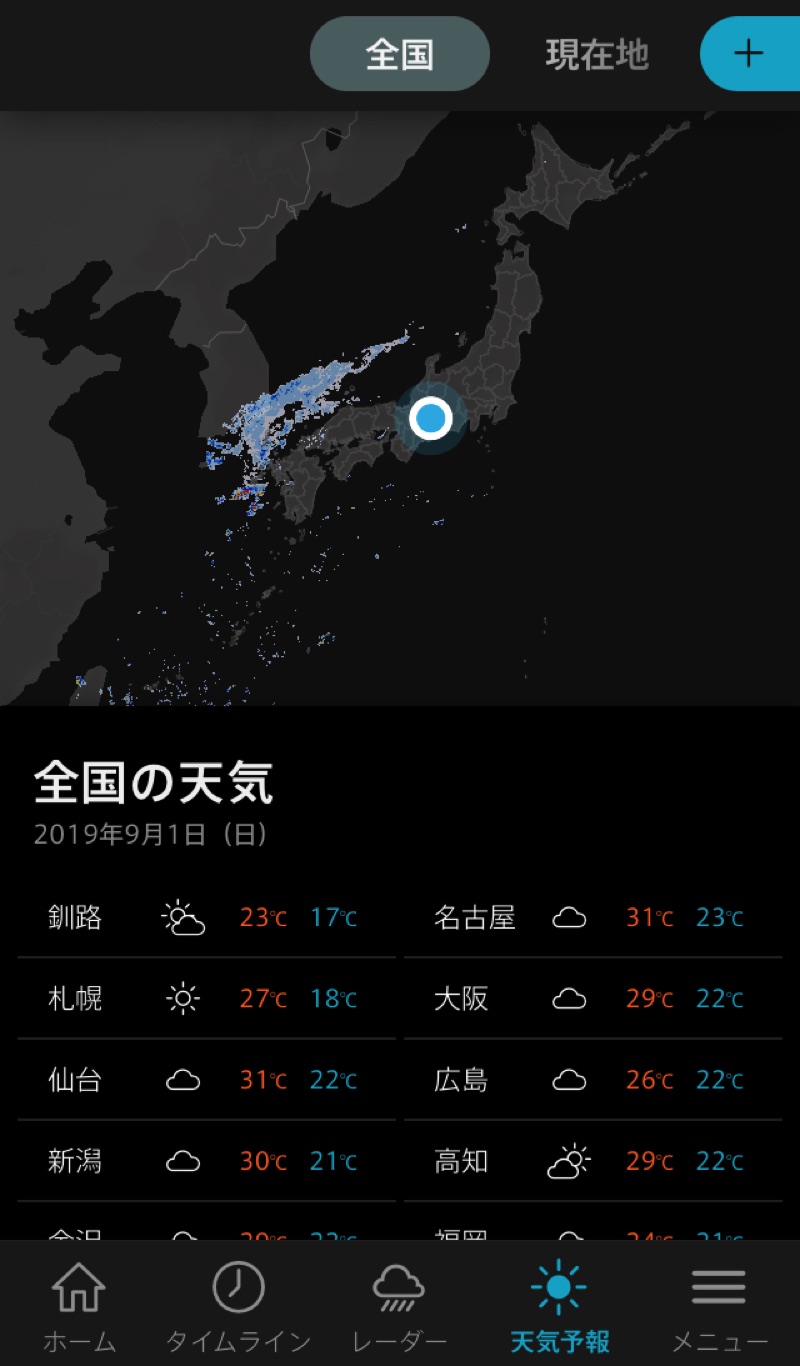 天気や台風の予報、雨雲レーダー、地震・津波・噴火の速報、特別警報や土砂災害の情報、河川の情報、大雨危険度通知、さらにはJアラート(国民保護情報)やダム放流通知まで、一つのアプリで様々な防災情報を受信できます。画面に表示された地図をタッチすることで、今いる地点を拡大したり、全国を見渡すことができ、雨雲の様子や各地の震度を自由な縮尺で見ることができます。