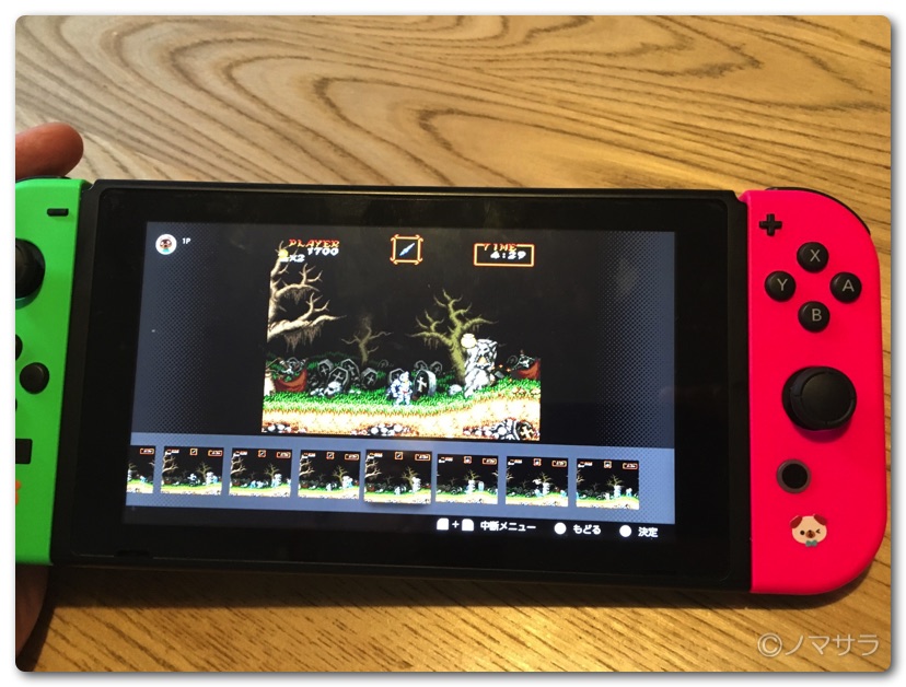そしてこのサービス一番のメリットが巻き戻し機能があること。どんな時でも「ZLボタン+ZRボタンを長押し」すると、少しだけ時間を巻き戻すことができます。ゲームオーバーやミスをしてしまった時など、失敗する前に戻ってゲームをやり直すことができるため超ムズの魔界村などでは何度もやり直せて最高!