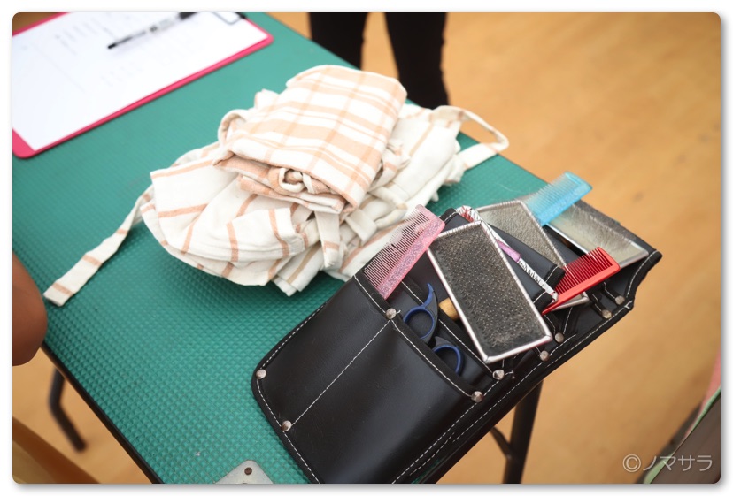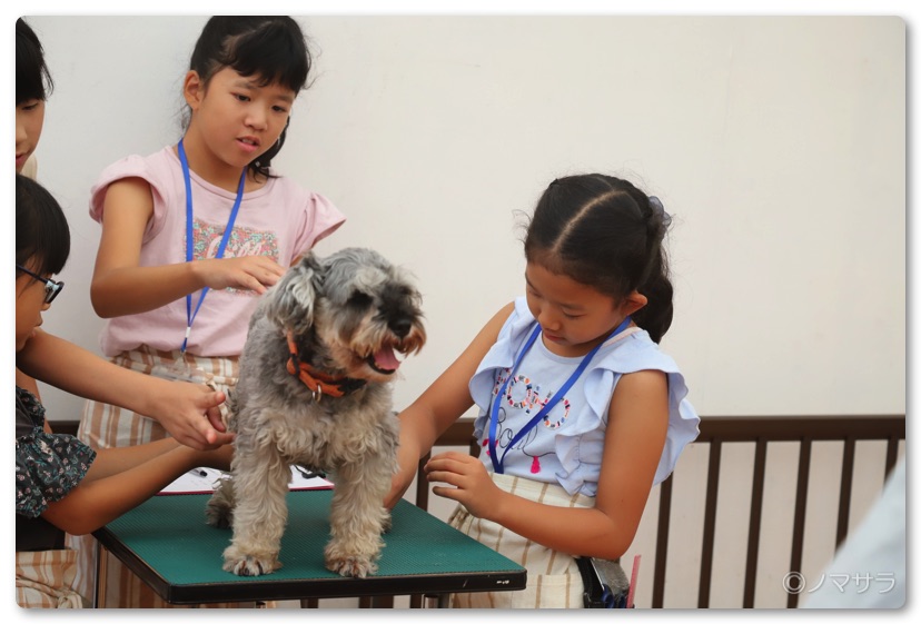 トリマー体験のプログラムは受付をしてわんちゃんのカルテの書き方やコーム、ブラシ、はさみの使い方を一通り学んだ後、ウィッグでカットの練習をしてから本番となりました。