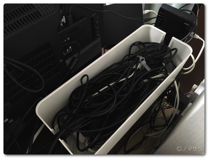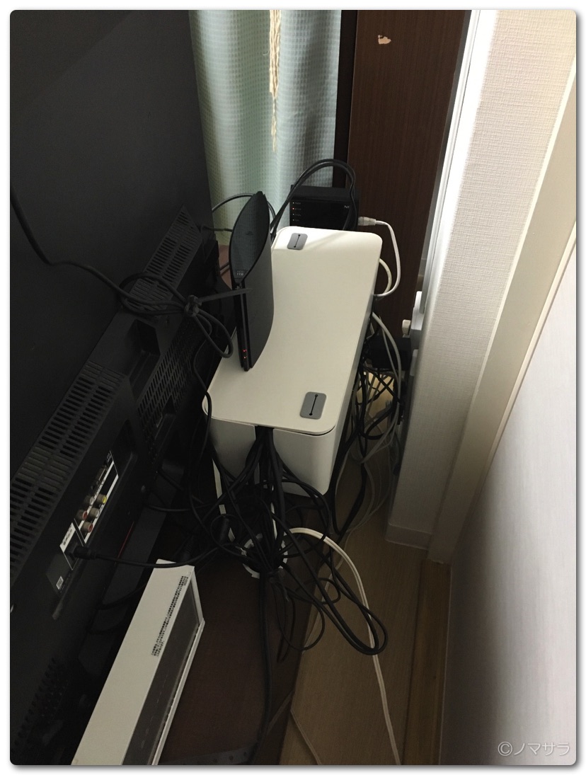 テレビ周りにはBDレコーダーをはじめ、録画用HDD、PS4、PSVR、NTTの光回線ルーター、Wi-Fiルーター、ニンテンドースイッチなど電源がいるものがたくさんありすごい状態になっていましたがケーブル収納ボックスに入れたら、相当スッキリしました。以前は床にケーブルがぐちゃぐちゃに這っていたのですが、それがすべてボックスの中に収まり妻もご満悦。