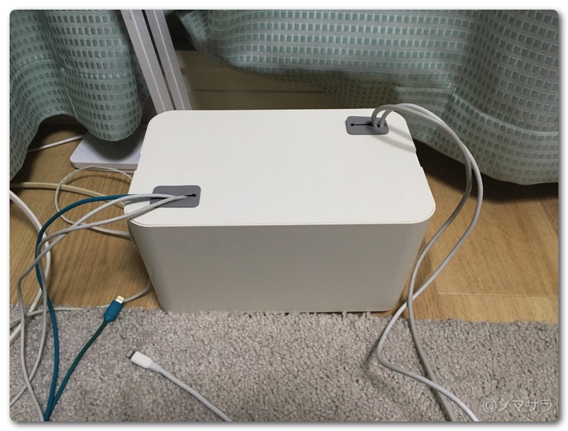 もう一方のショートサイズはAnkerの充電器を入れました。蓋にはケーブルを出せる穴がついているため適度な長さに調整することができます。以前は枕元にケーブルが散らかっていたのですが見事にスッキリしました。
