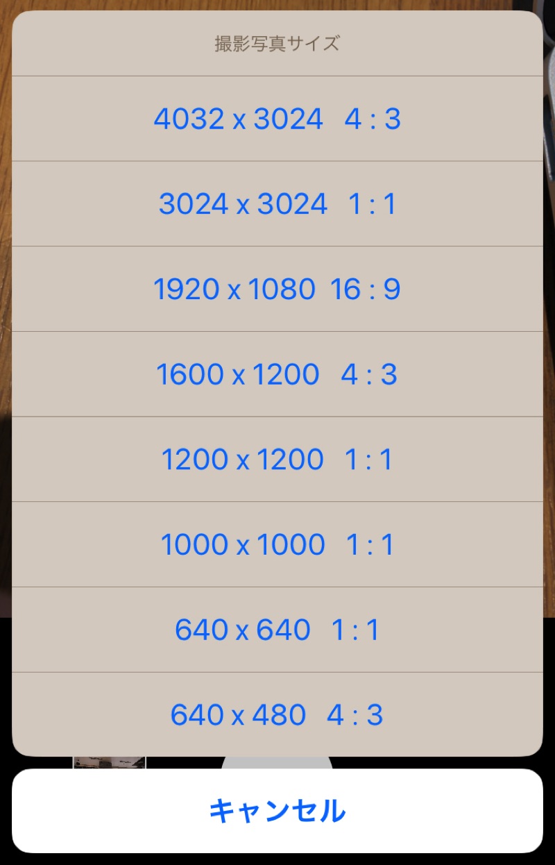 解像度は4032 x 3024 (4:3), 3024 x3024 (1:1), 1920 x 1080 (16:9)ほか合計8パターンの中からサイズ選択が可能。オススメは1600×1200 4:3か1920×1080 16:9のどちらか。iPadなどのタブレットで見ても十分な解像度かつ容量が小さくなるのでこのぐらいがオススメ。この解像度でもアップにしたら瞳の景色は判別されるかもしれませんので、極度のアップ自撮りにはご注意を。