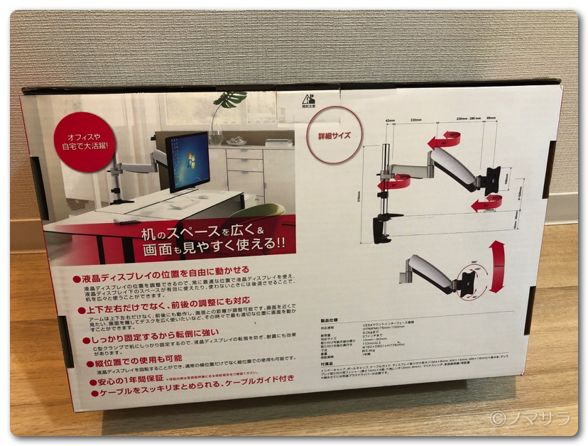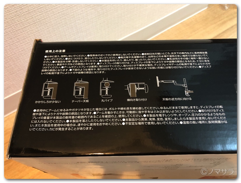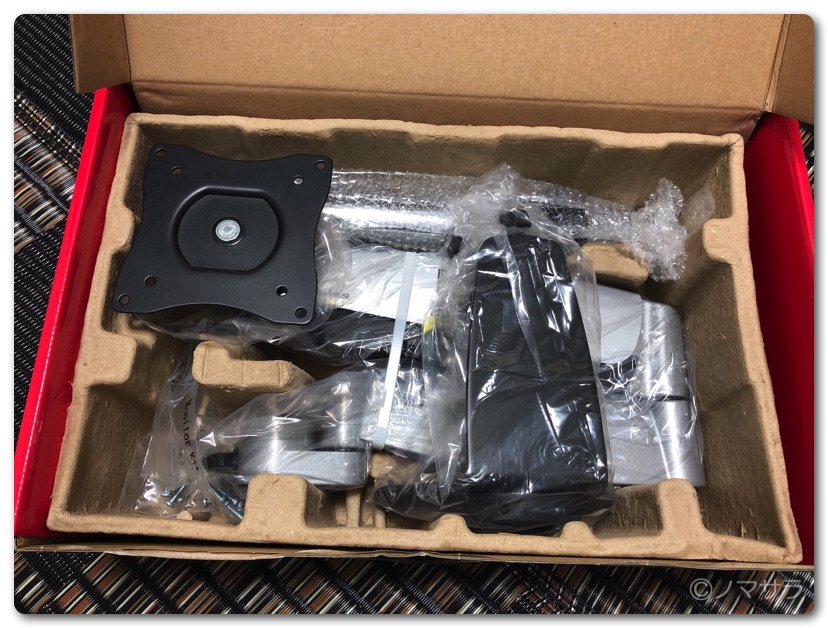 モニターアームはコンパクトに畳まれた状態で箱に入っています。ナイロンバンドを外すと勢いよくアームが開くので注意が必要。