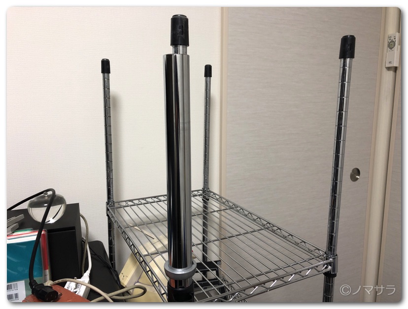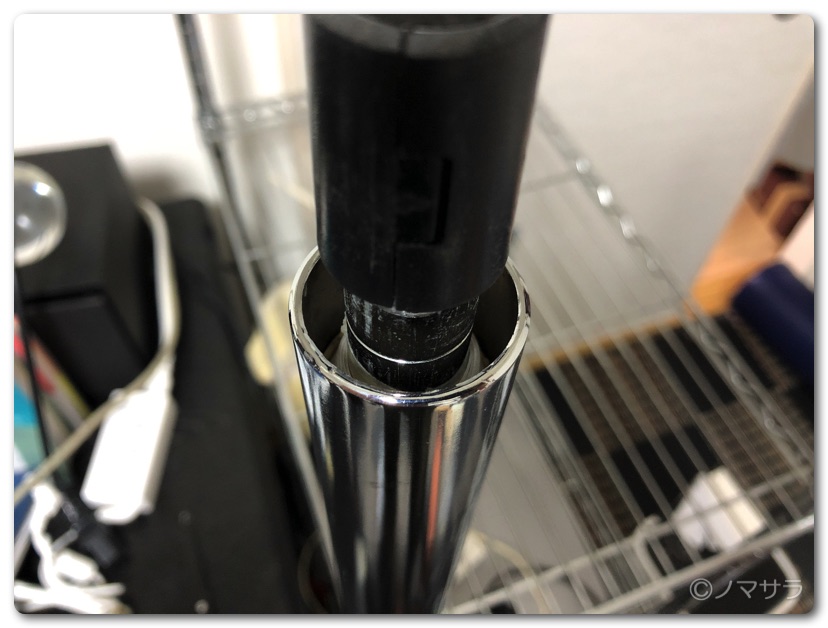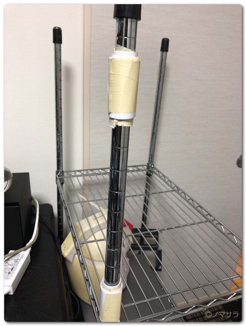 机を挟むクランプが付属していますがワタクシの作業環境では使いません。すぐ横にシェルフがあるので直接パイプに通して使います。ただし、シャフト径がかなり違い、そのままでは隙間ができてグラグラするため、厚紙とマスキングテープを巻いてぴったり合うように調整しました。