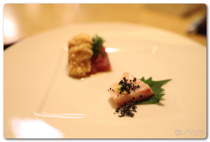 霜降り秋鰆の塩昆布添えとメジマグロの変わり山掛け